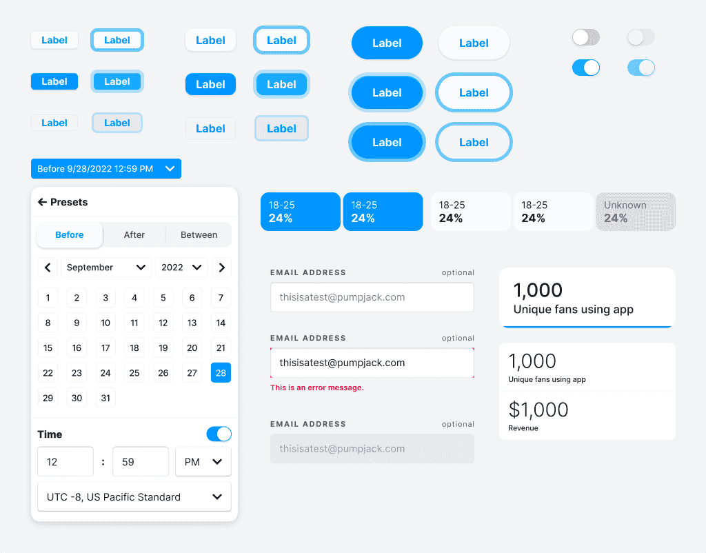 We started with a default "Pumpjack Blue" palette and built theme slots for client overrides without breaking structure or legibility.