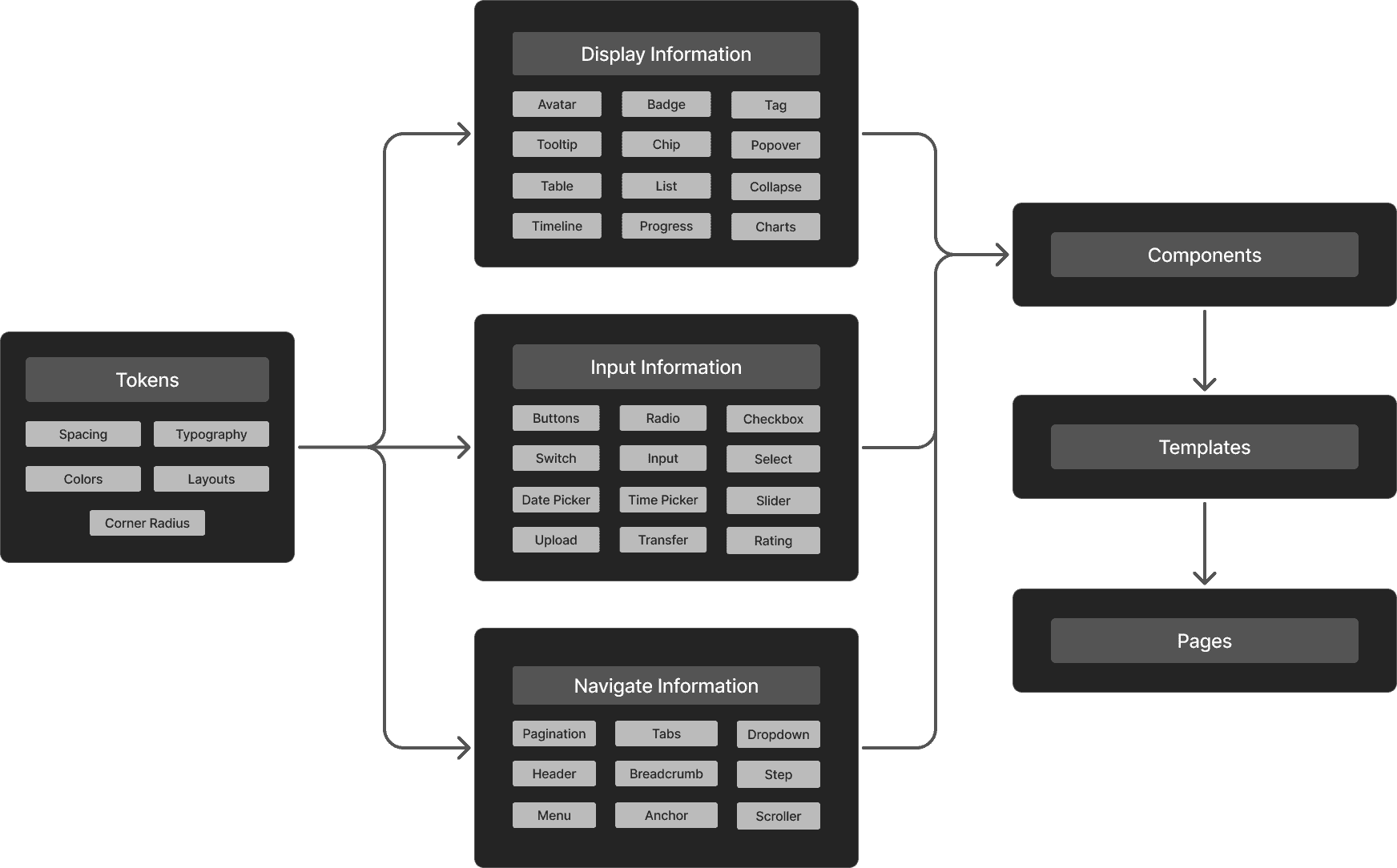 We followed Brad Frost’s Atomic Design model, which gave our system structure: