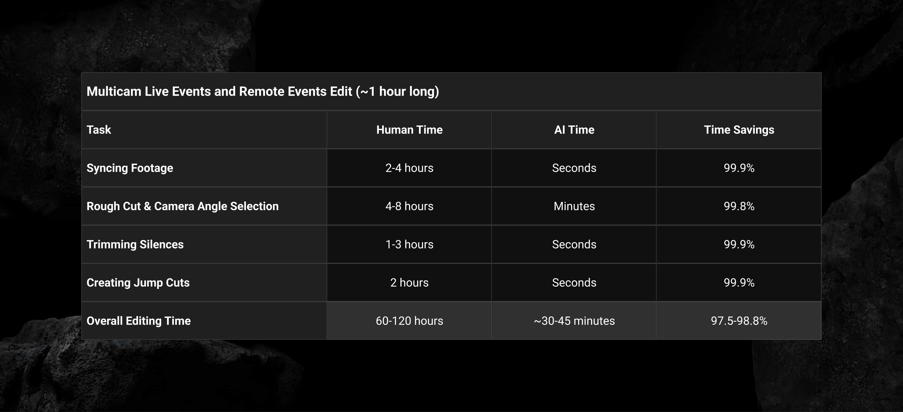 The problem was obvious: video editing takes forever and is expensive. Syncing footage, picking camera angles, trimming silences, adding graphics, it all adds up. And for teams trying to produce at scale, those hours turn into weeks.